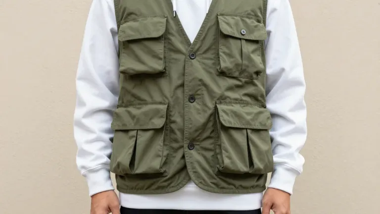 A model wears an olive utility vest with multiple pockets, showcasing a rugged and durable fabric under soft, even lighting. The neutral background and centered composition emphasize the vest's design and functionality.