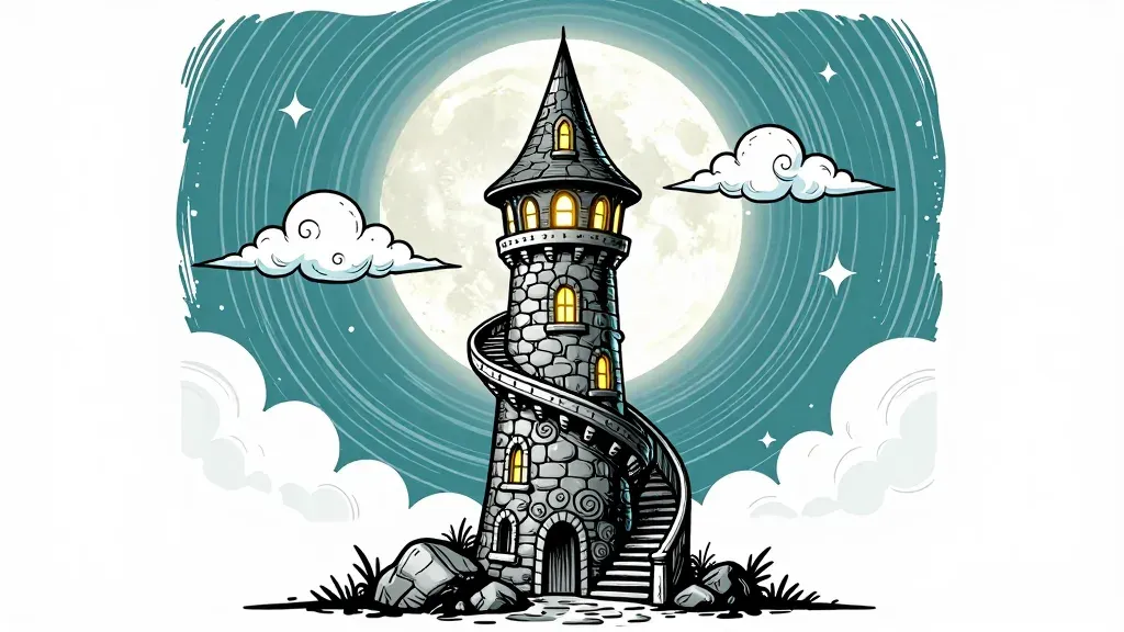 A mystical wizard's tower bathed in the soft, golden glow of a full moon, with intricate carvings and rough stone walls. The composition leads the eye up the spiral staircase, framed by clouds and stars, creating a sense of depth and enchantment.