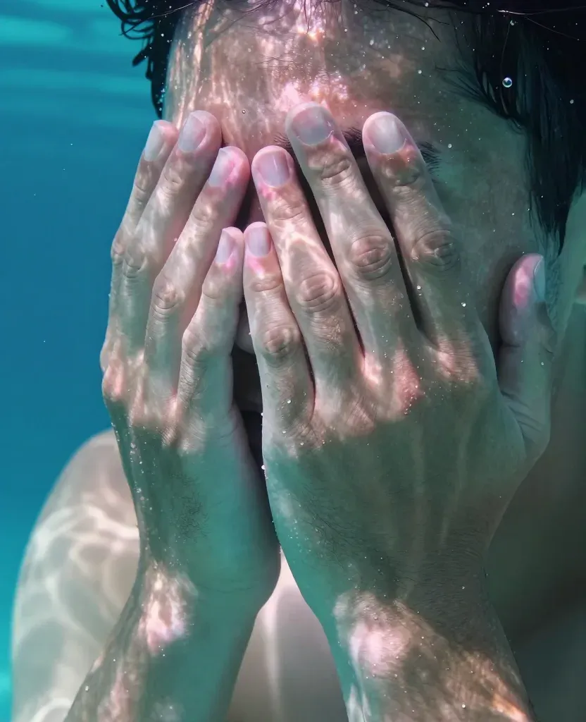 Rough, calloused hands cover a face underwater, illuminated by diffused, soft light creating a gentle glow. The shallow depth of field isolates the hands and face against a blurred blue water background.