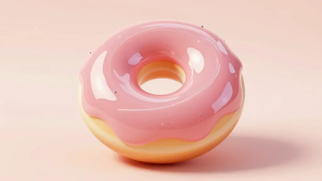A golden donut ring is coated with a glossy pink glaze, softly lit from above, creating reflections and highlights on the glaze. The blurred, soft peach background provides a clean and unobtrusive backdrop, emphasizing the donut's three-dimensional form.