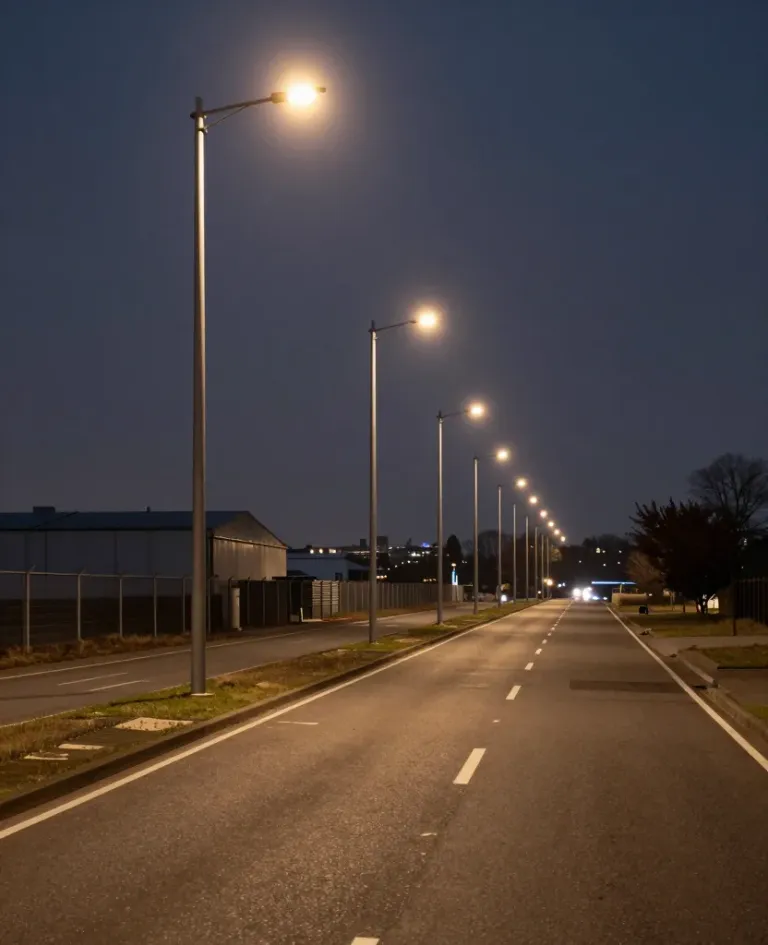 Warm yellow streetlights cast a soft glow on the smooth asphalt road, leading the viewer's eye towards the horizon. The industrial setting, with its fences and sparse trees, adds a sense of depth and realism to the scene.