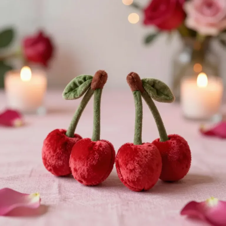 Two handcrafted plush cherry pairs with fuzzy red fabric and coarse green felt stems and leaves are arranged symmetrically, illuminated by soft candlelight that highlights their tactile surfaces. The shallow depth of field isolates the cherries against a blurred background of candles, rose petals, and floral arrangements, creating a romantic and intimate atmosphere.