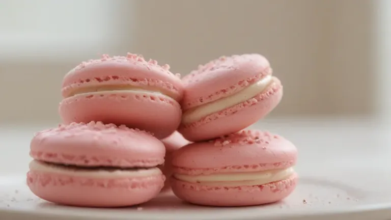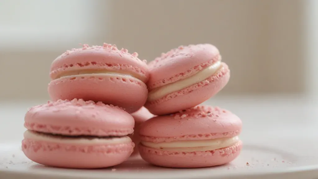 A stack of pink macarons with cocoa-dusted shells and a creamy filling, softly lit from above, creating gentle shadows and a sense of depth. The blurred neutral white background keeps the focus on the macarons, offering ample copy space for design elements.