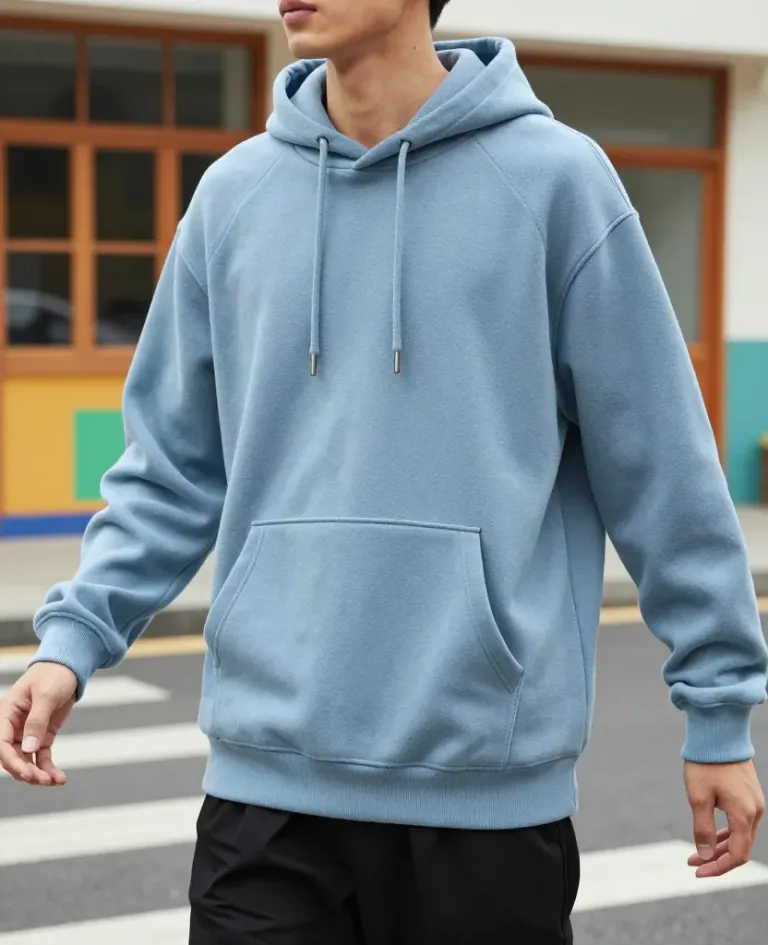 A person stands in a mid-shot wearing a pastel-blue hoodie, bathed in warm, golden light that creates soft shadows. The blurred urban background with muted green and yellow tones adds depth and context to the image.