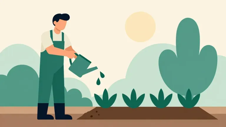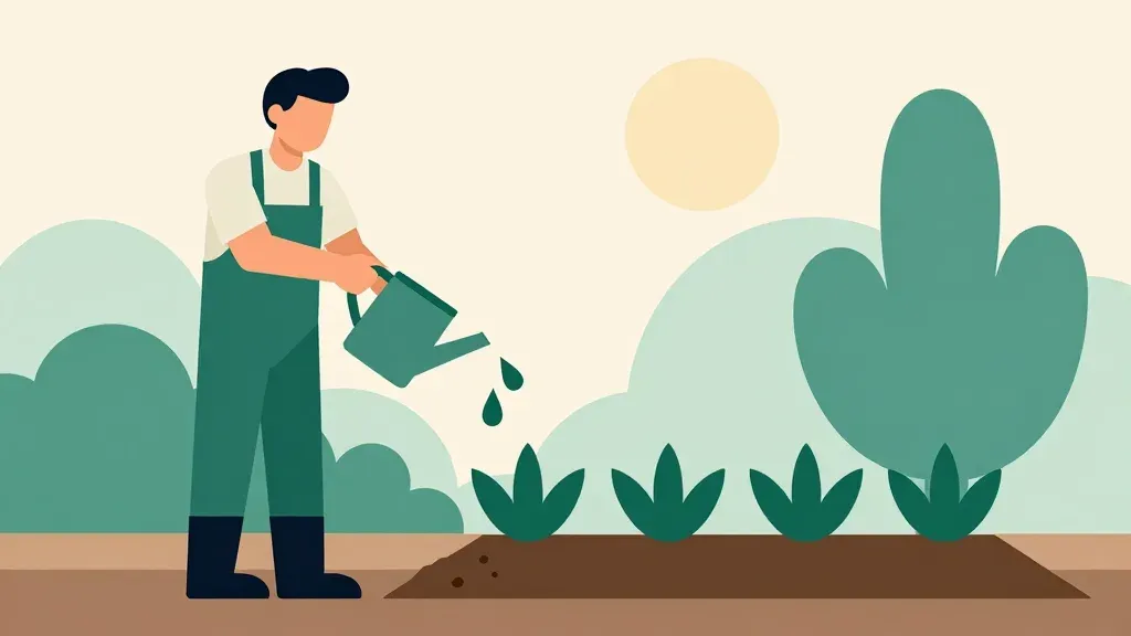 A man bends over to water plants with a glossy watering can, set against a backdrop of lush greenery and a soft, warm sun. The image is composed with a shallow depth of field, focusing on the subject while the background is slightly blurred, creating a serene and natural setting.