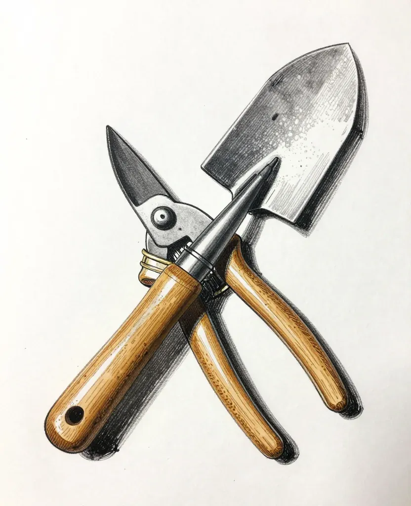 A close-up of a pair of garden tools, featuring wooden handles and metallic blades, set against a plain white background. Directional lighting highlights the textures and creates sharp shadows, emphasizing the tools' details and craftsmanship.