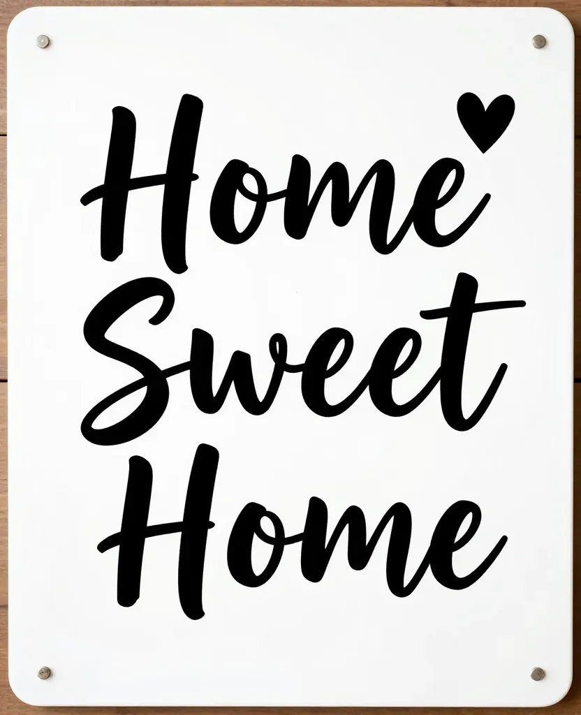 A glossy white 'Home Sweet Home' sign with a cursive font and a small heart symbol, softly lit to highlight its texture, set against a slightly blurred wooden background. The composition offers ample copy space for various design applications.