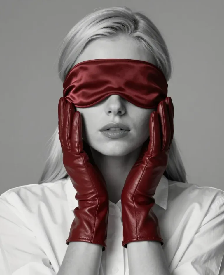 A close-up of a figure with a crimson blindfold and leather-gloved hands, set against a soft, diffused light that highlights the textures of the blindfold and gloves. The neutral, blurred background emphasizes the subject and creates a clean, focused composition.