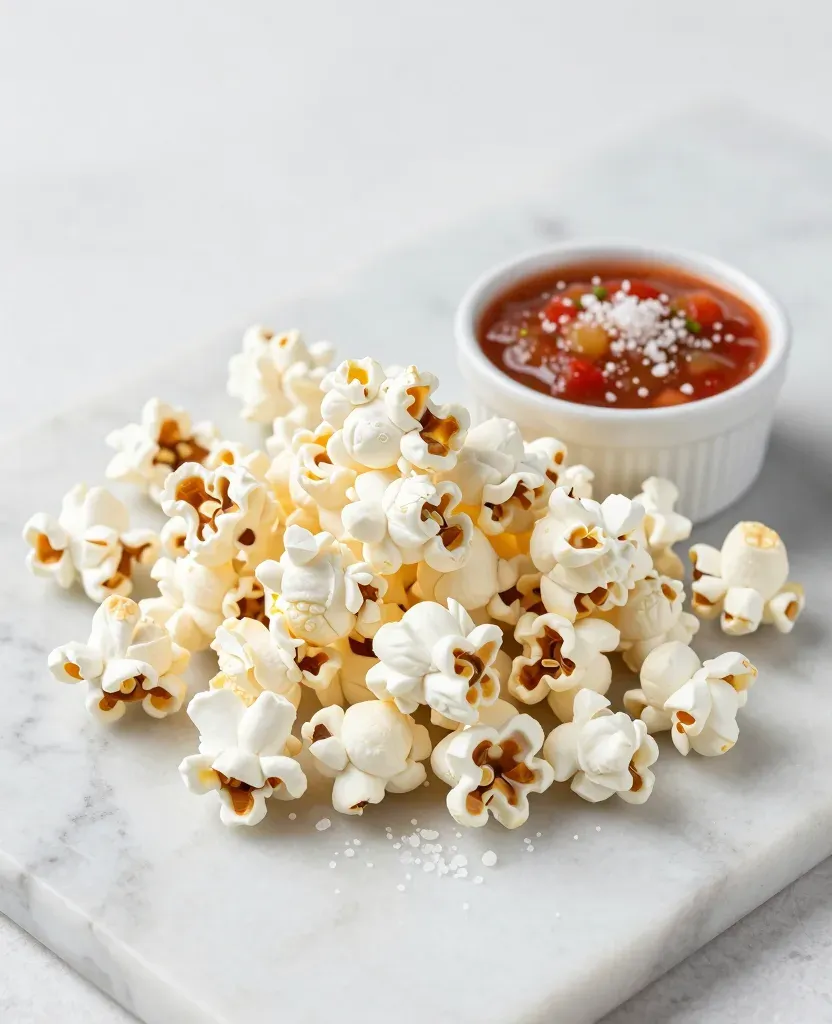 Soft, fluffy popcorn kernels glisten under warm, diffused lighting, creating a cozy atmosphere. The clean marble background enhances the focus on the popcorn and sauce, offering ample copy space for text or branding.