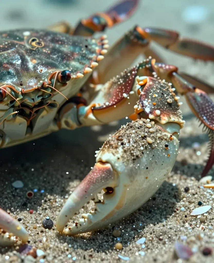 A close-up of a crab's glossy claw, textured with rough spines, set against a backdrop of sand and small pebbles, softly lit to highlight the intricate patterns and natural sheen of the exoskeleton.