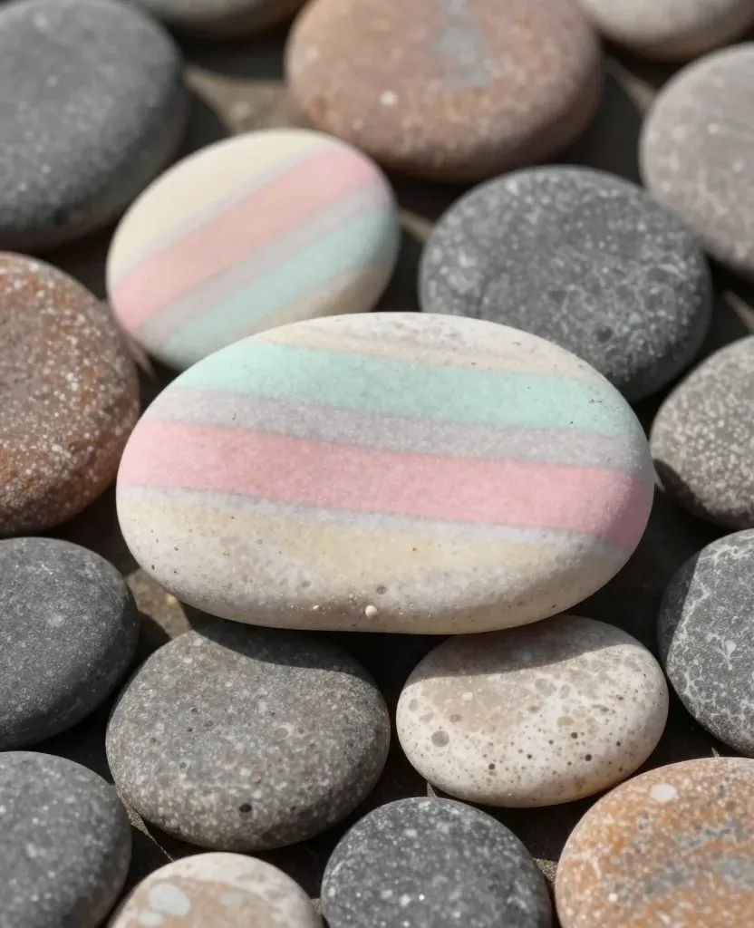 A close-up of a smooth, pastel-striped pebble bathed in soft, natural light, highlighting its vibrant colors and subtle texture. The blurred background of gray pebbles adds depth and context to the image.