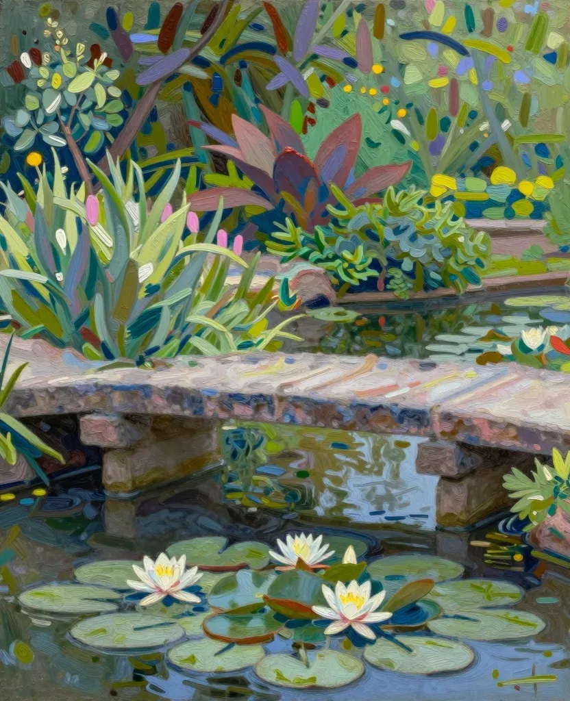 A serene scene featuring a stone bridge with a mosaic surface, surrounded by water lilies and lily pads, bathed in diffused, soft light that creates a gentle glow on the water and foliage. The abstract background slightly blurs, emphasizing the bridge and water as the focal point.