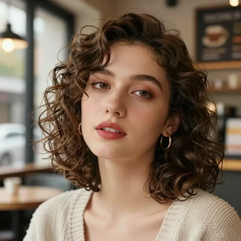 A woman with tousled, curly brown hair and a light, textured top is captured in a close-up shot, illuminated by soft, natural light from the window, highlighting the glossy sheen of her hair and the delicate texture of her top. The blurred café interior with wooden shelves and coffee-related decor in the background provides a warm, inviting setting.