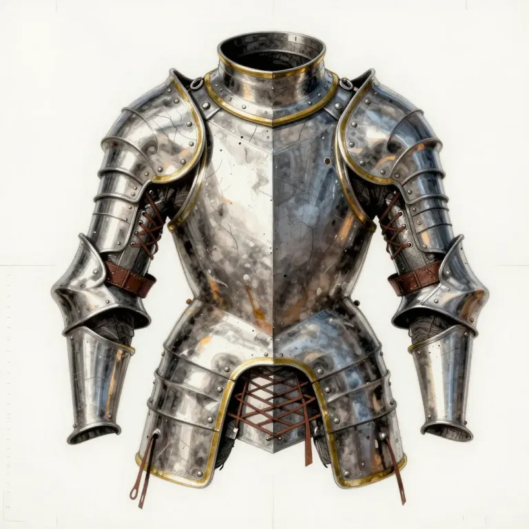 A close-up of a medieval cuirass with glossy metal, rivets, and seams, highlighted by soft, diffused lighting that accentuates its form. The minimal white background emphasizes the armor's intricate design and texture.