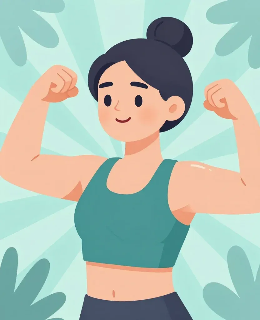 A woman with dark hair in a bun wears a teal crop top and dark bottoms, flexing both arms with a cheerful expression, her smooth skin and glossy bun highlighted by soft, diffused light. The centered medium shot with symmetrical framing and radiating leaf-patterned background creates a clean, focused composition with ample visual emphasis on strength and vitality.