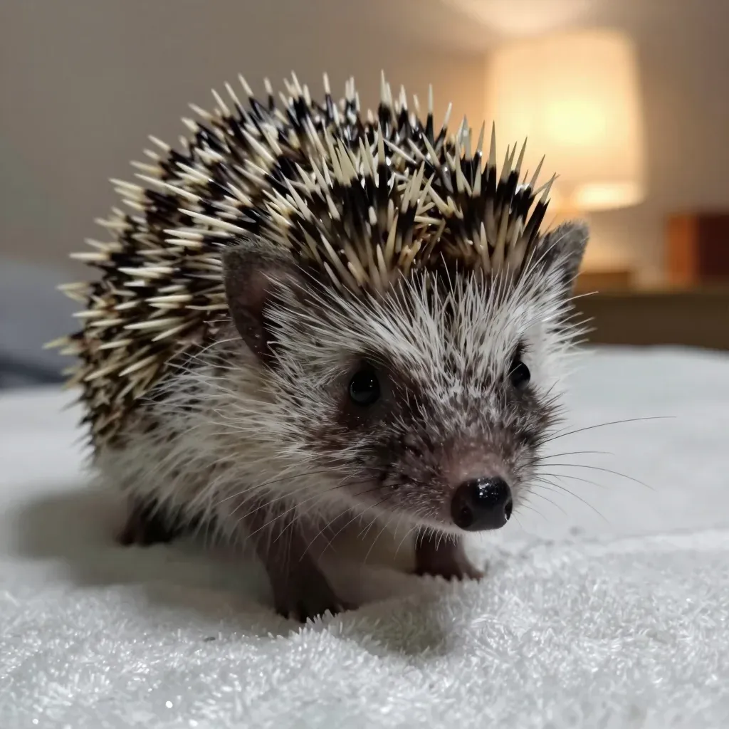 A close-up of a hedgehog with glossy quills and soft fur, sniffing curiously on a white towel, illuminated by warm, golden light that highlights the texture and creates soft shadows. The shallow depth of field blurs the background, focusing attention on the hedgehog's face and upper body.