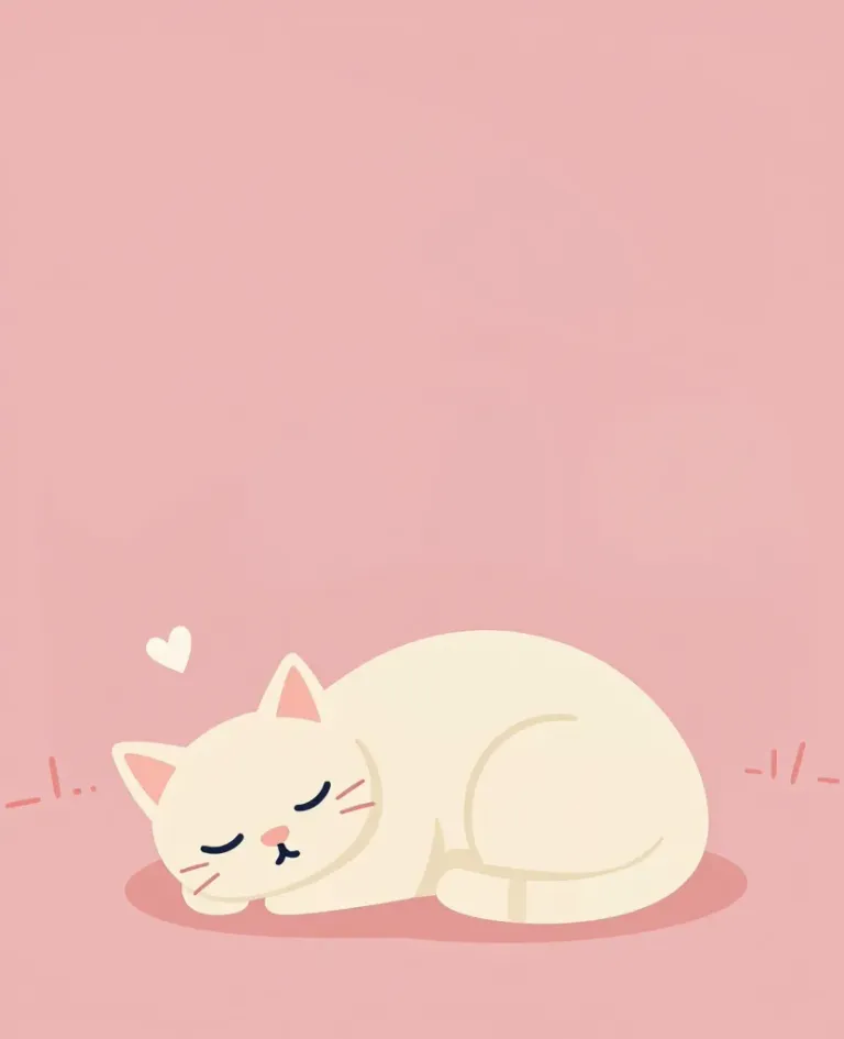 A serene white kitten sleeps curled into a compact shape, its eyes closed and cheeks tinged with soft pink, rendered in a smooth, velvety cartoon style. Diffuse overhead lighting creates gentle highlights and a subtle shadow beneath, set against a clean, uniform pale pink background with minimal negative space and decorative dashes.