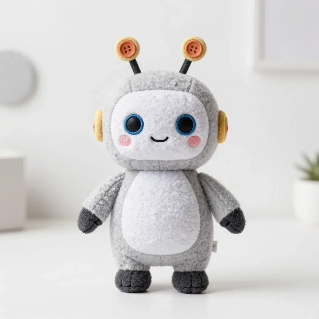 A soft, plush robot toy with large blue eyes and pink cheeks, bathed in soft, diffused light that enhances its texture and creates a warm, inviting glow. The minimalist background with a white wall and hint of greenery adds to the clean and simple aesthetic, providing ample copy space for design purposes.