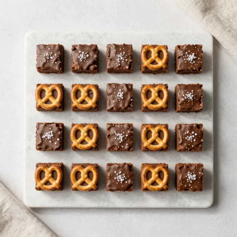 Glossy chocolate brownies topped with pretzels and coarse salt, arranged in a neat grid on a marble slab, highlighting the textures and creating subtle shadows. The neutral gray marble slab provides a clean and elegant backdrop.