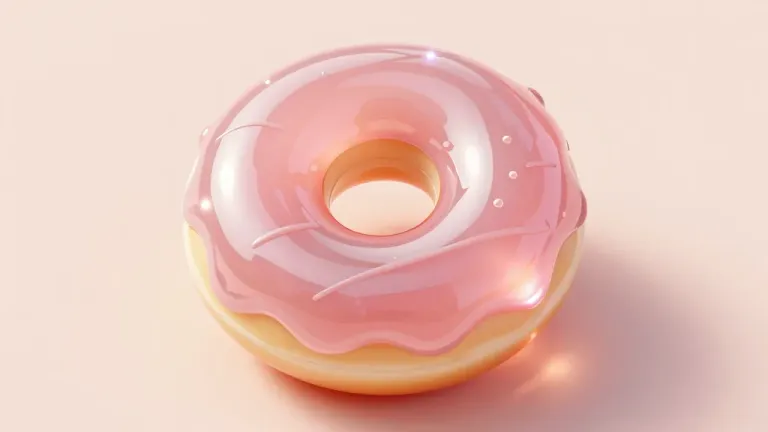 A close-up of a crystal-clear donut ring with glossy pink icing, highlighted by soft, diffused light from above, creating a vibrant and inviting appearance. The blurred neutral pink background ensures the focus remains on the donut's texture and color, making it ideal for culinary and food-themed designs.