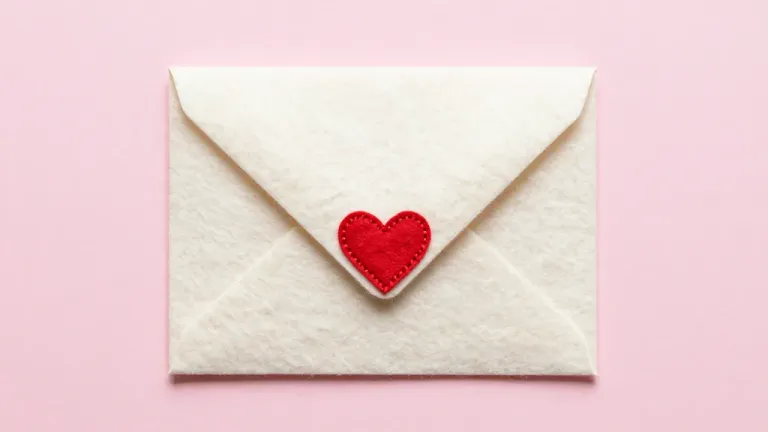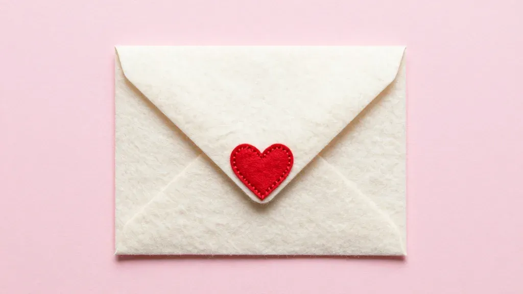 A white envelope adorned with a red felt heart sits centered against a soft pink background, illuminated by diffused light that creates gentle shadows and highlights. The clean and simple backdrop provides ample copy space for various design applications.