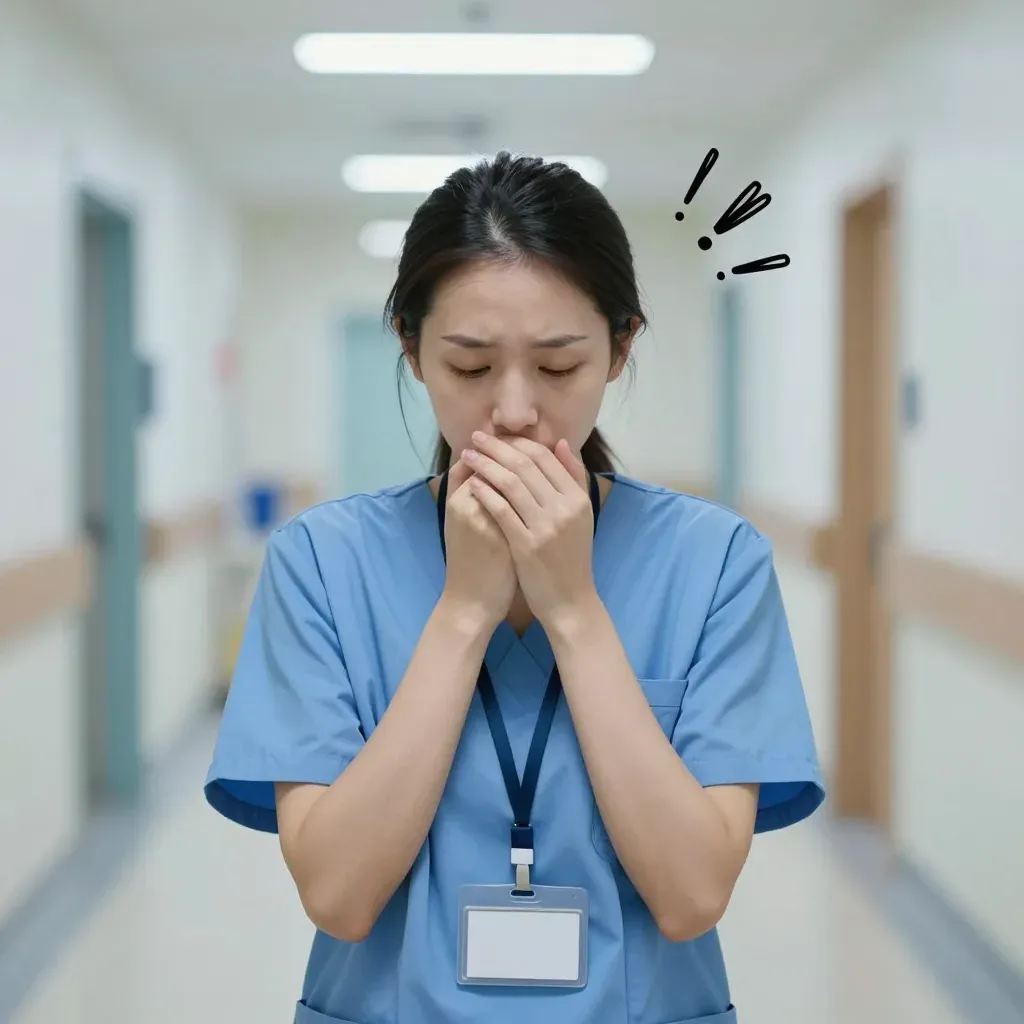 A nurse in blue scrubs clutches her hands to her face, conveying distress in a clinical hospital corridor. The fluorescent lighting casts a stark, clinical light, emphasizing the nurse's emotional state.