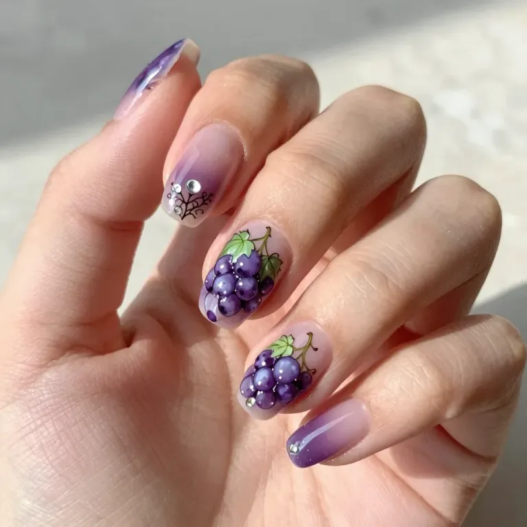 A hand showcases intricately designed nails featuring grape-vine accents in a soft purple gradient, deep purple, lavender, green, and white. The soft, natural light highlights the glossy, smooth finish and detailed nail art, while a shallow depth of field blurs the neutral, light-colored background.