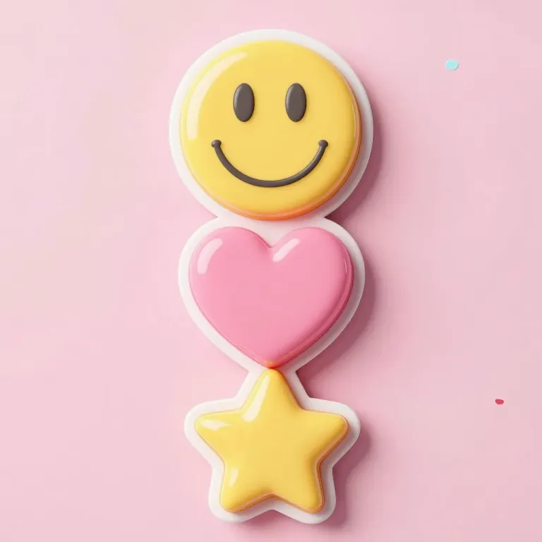 A glossy, smooth, almost edible-looking smiley face, heart, and star stacked vertically against a soft pink background. The warm, directional lighting highlights the glossy surfaces, creating a vibrant and cheerful composition.