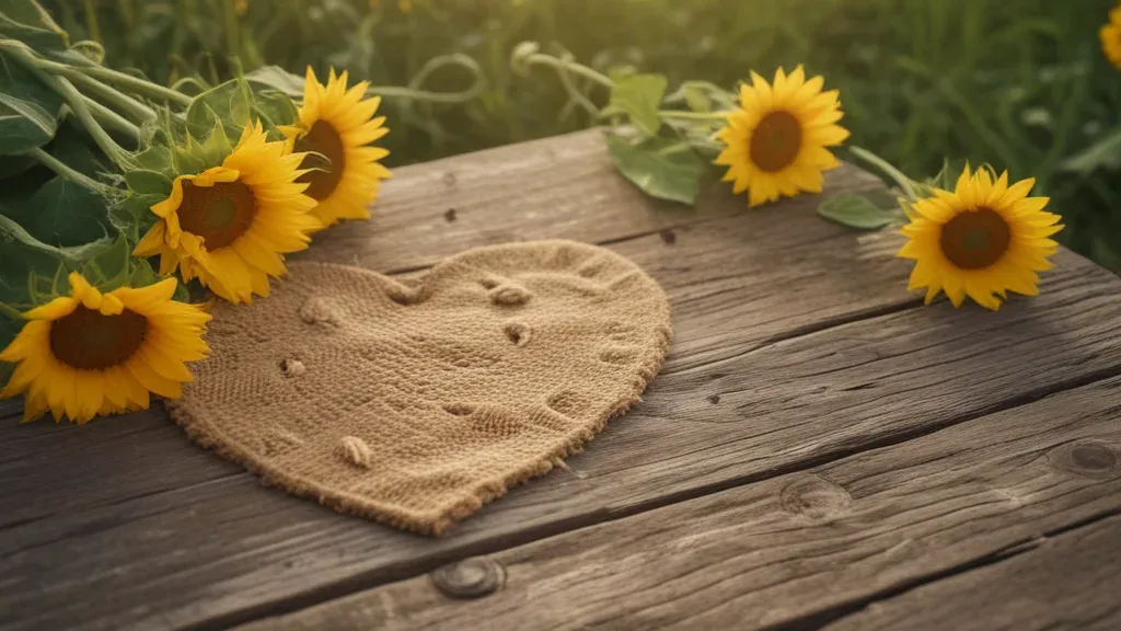 A heart-shaped knitted blanket with a rough texture is surrounded by vibrant sunflowers, bathed in soft, warm sunlight that highlights the textures of the blanket and flowers. The blurred greenery in the background adds depth and context to the serene rural setting.