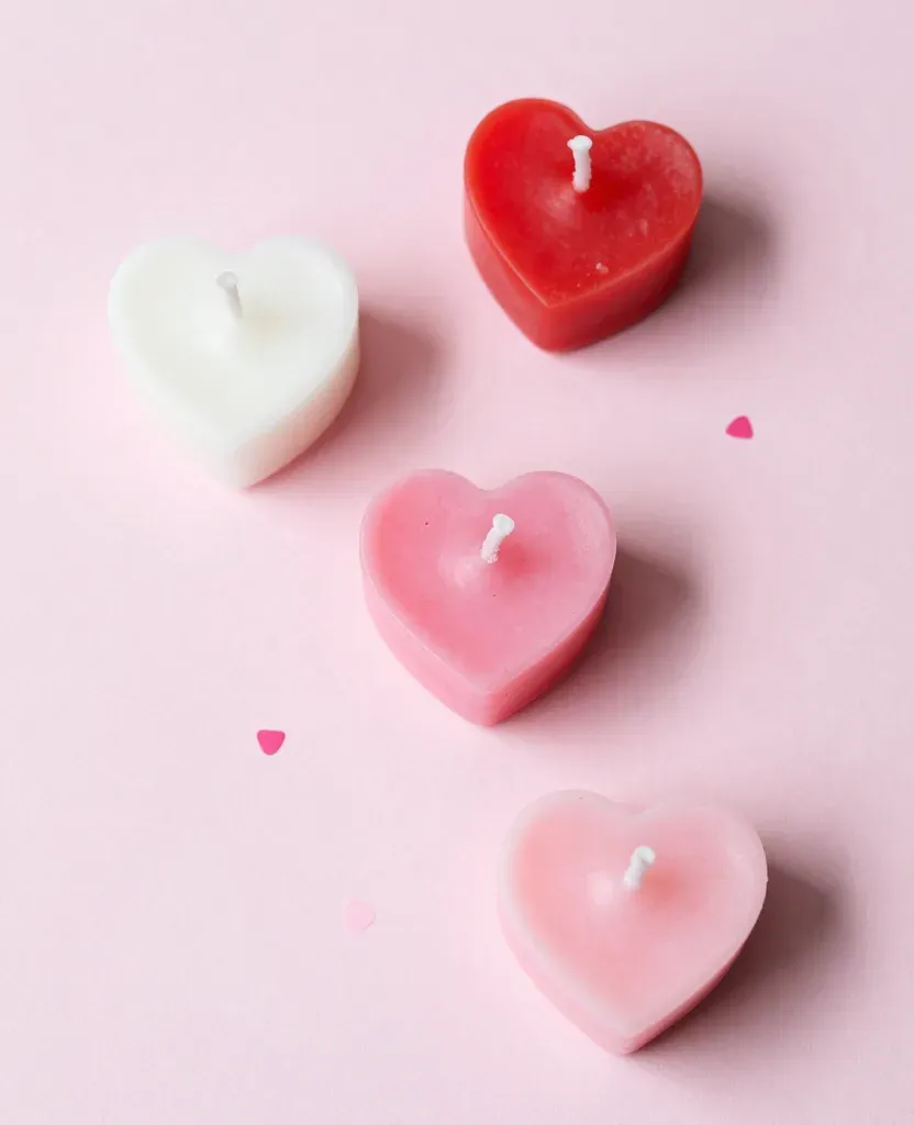 A trio of heart-shaped candles in white, red, and two shades of pink are arranged in a loose triangular formation, creating a balanced and harmonious composition. Soft, diffused light highlights the glossy surfaces and creates gentle shadows, enhancing the smooth, translucent texture of the candles against a pastel pink background.