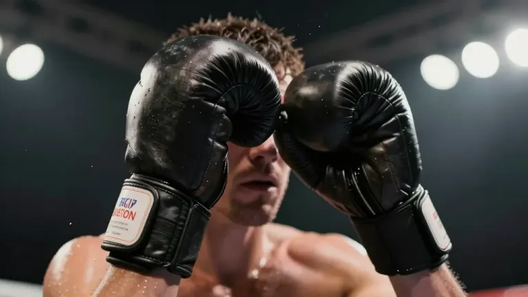 A male boxer holds his hands up in a defensive guard, his face partially hidden by glossy black leather gloves, with sweat-slicked skin and defined musculature visible under harsh overhead lighting. The shallow depth of field isolates the subject against a blurred arena background with circular bokeh from ring lights, emphasizing intensity and focus.