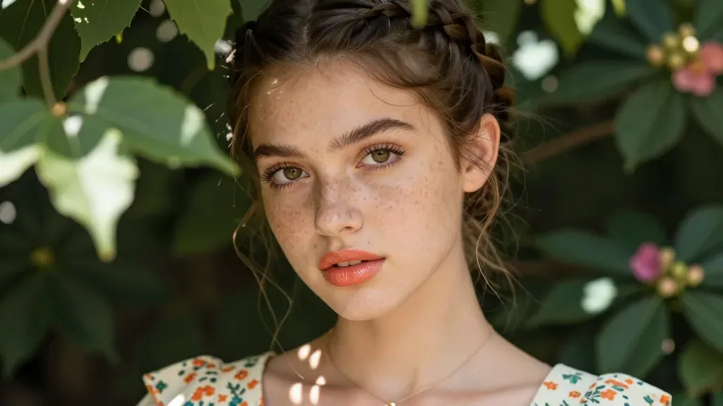 A young woman with freckles and glossy red lipstick gazes directly, her soft skin and floral blouse contrasting with the lush green foliage. The dappled light and shallow depth of field create a serene, intimate portrait.