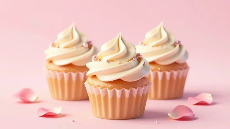 Three cupcakes with creamy white frosting and pink and silver beads are arranged in a centered, slightly elevated composition against a soft pink gradient background. The warm, diffused lighting highlights the smooth texture of the frosting and the sheen of the beads, creating a visually appealing and elegant scene.