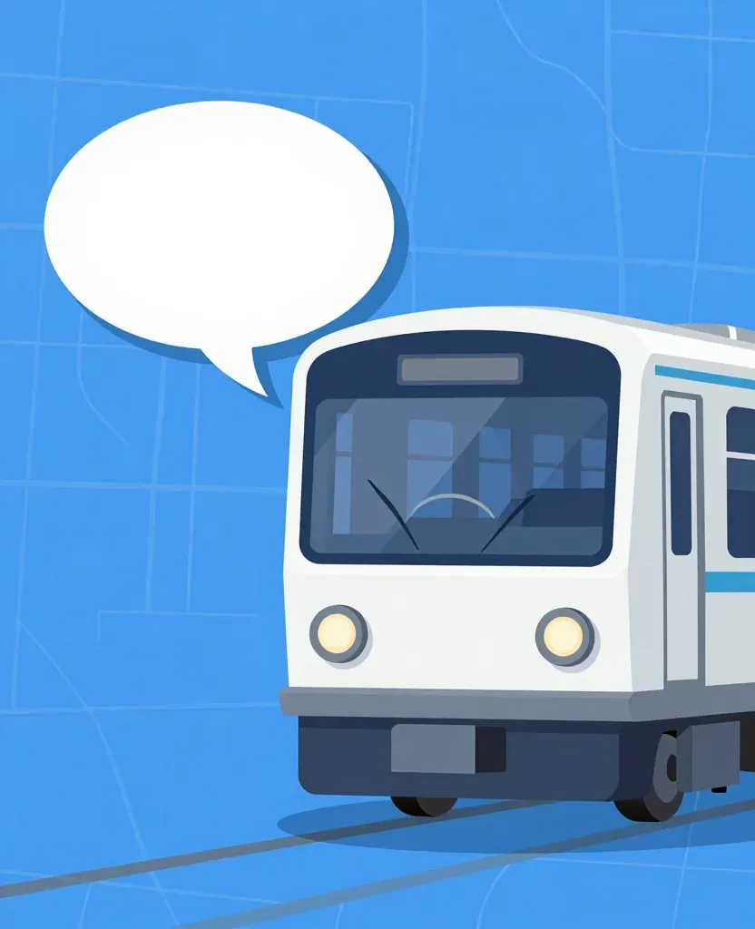 A glossy white modern train with a large, curved windshield is positioned slightly off-center, with a speech bubble adding a focal point. Soft, diffused sunlight highlights the train's surface, creating gentle reflections against a simple blue grid background.
