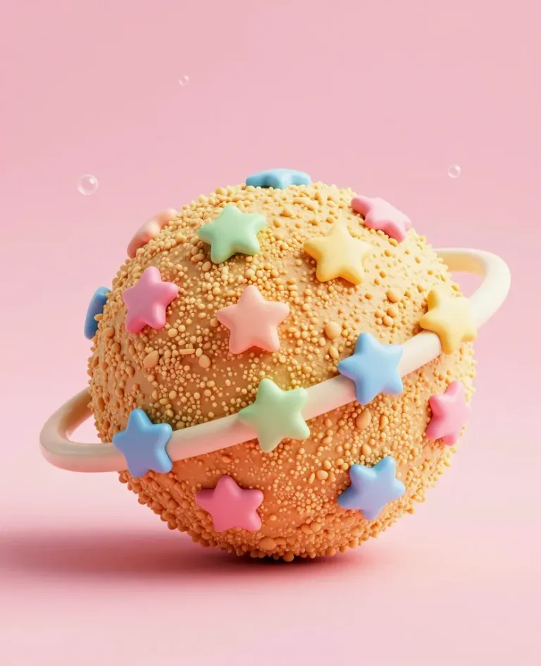 A soft, crumbly cookie textured planet adorned with pastel stars, illuminated by diffused light creating a dreamy ambiance. The clean pink background enhances the subject, providing ample copy space for design integration.