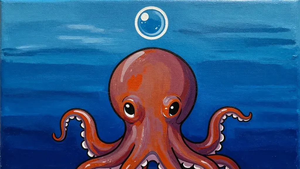 A glossy, translucent octopus with delicate white suction cups glides through a deep blue ocean, illuminated by soft, diffused light that highlights its skin and creates subtle reflections. The composition is centered, with the octopus and a small white bubble as focal points, creating a sense of depth and movement, while the blurred background emphasizes the subject and adds a sense of depth.