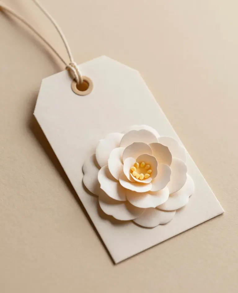 A delicate paper camellia flower with soft, glossy petals is centered on a smooth white gift tag, illuminated by diffused, warm light that creates soft shadows and highlights. The neutral beige background provides a clean and uncluttered backdrop, emphasizing the flower's intricate details and the tag's elegant simplicity.