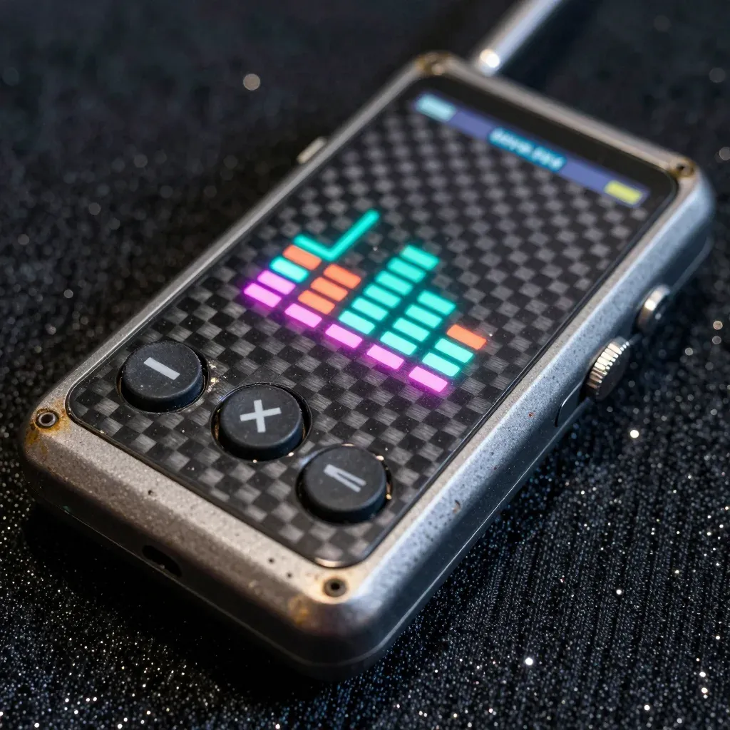 A close-up of an audio player showcasing a pixelated equalizer display, with soft diffused lighting creating subtle reflections and shadows. The shallow depth of field isolates the device against a dark, textured background, emphasizing its sleek design and vibrant color palette.