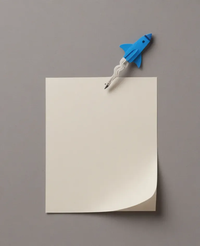 A white paper with a glossy blue rocket ship pinned on the edge, creating a sense of movement against a soft, even light and minimalistic gray background. The composition and lighting emphasize the subject, providing ample copy space for design elements.