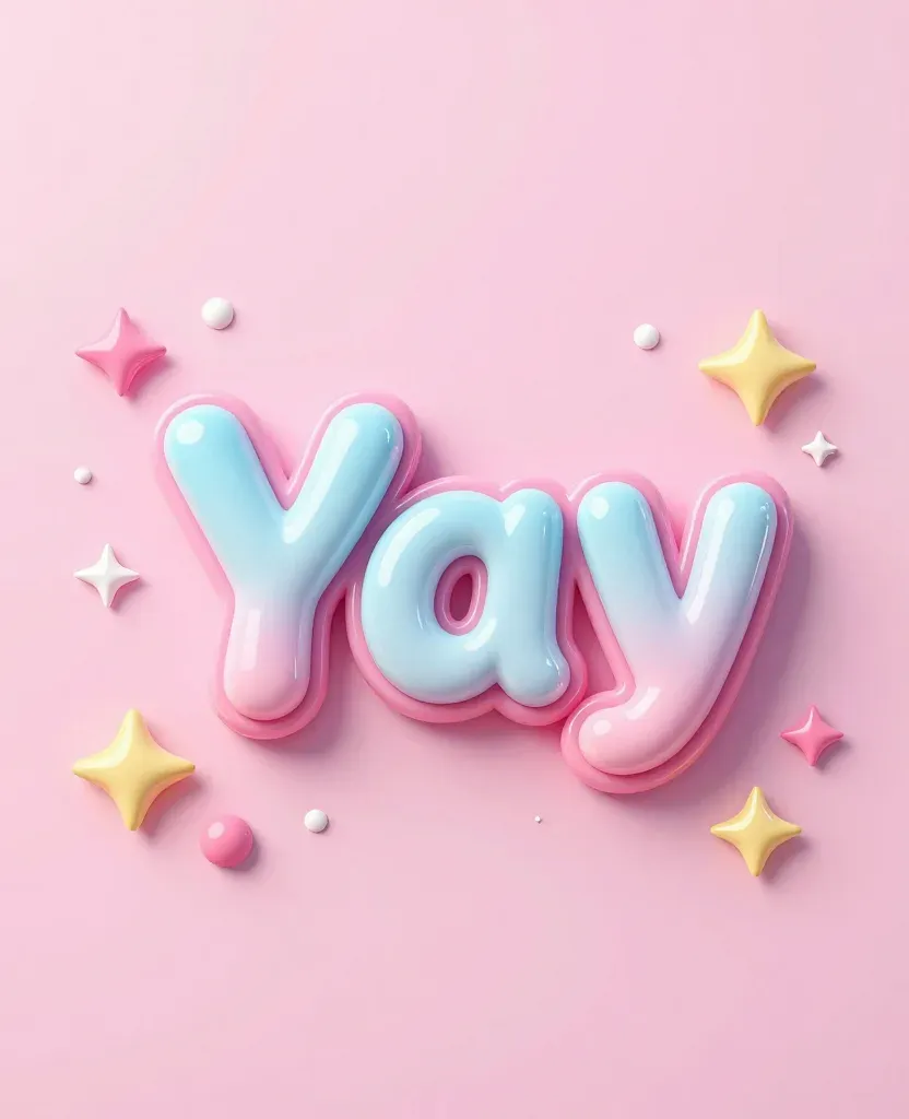 A glossy, liquid-like 'Yay' with starburst decorations in light blue, pink, yellow, and white, set against a soft, diffused light with gentle shadows enhancing depth. The clean, pastel pink background provides ample copy space for design integration.
