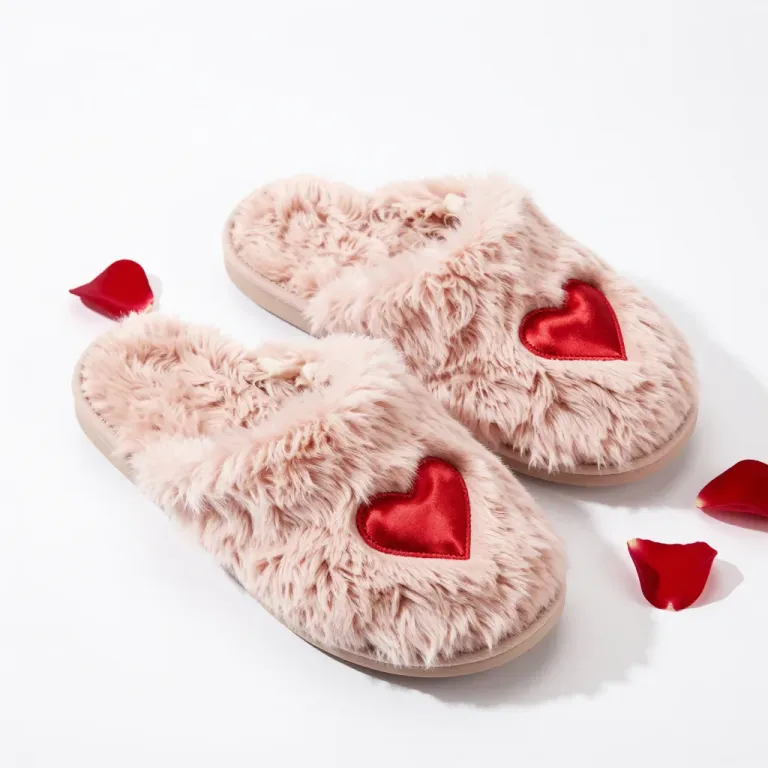 Soft pinkish-beige faux-fur slippers adorned with glossy red hearts, set against a clean white background with scattered red rose petals, creating a romantic and cozy atmosphere. The diffused lighting and slight tilt emphasize the texture and design of the slippers, making them perfect for product photography and marketing materials.