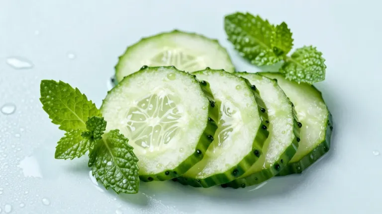 Crisp, juicy cucumber slices and fresh mint leaves are highlighted under soft, diffused lighting, emphasizing their vibrant green hues against a clean white background. The shallow depth of field draws attention to the textures and colors, making it ideal for culinary or health-related content.