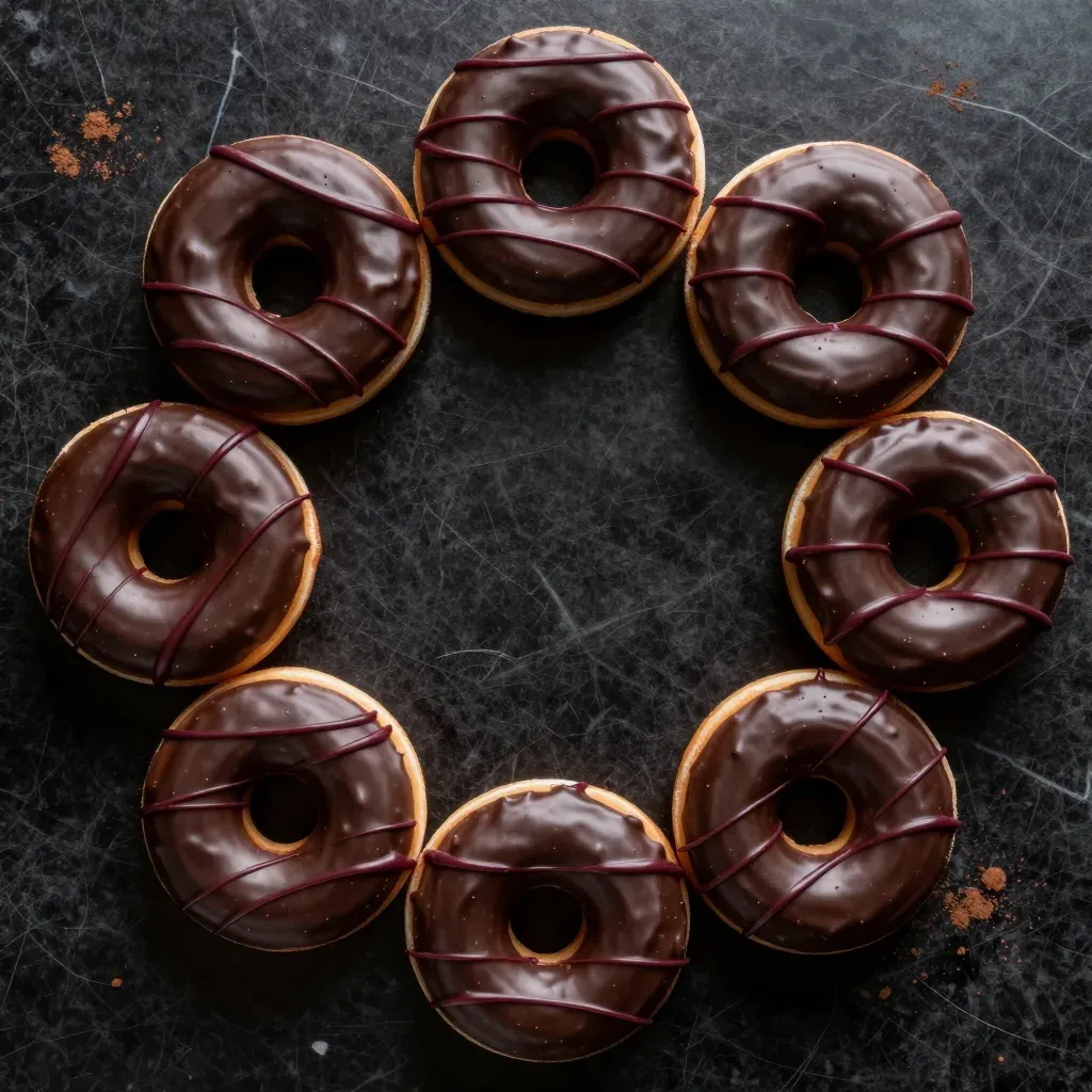 A circular arrangement of chocolate-glazed donuts with a rich burgundy drizzle, set against a dark, textured background. Soft, diffused lighting highlights the glossy texture and depth of the donuts, creating a visually appealing and symmetrical composition.