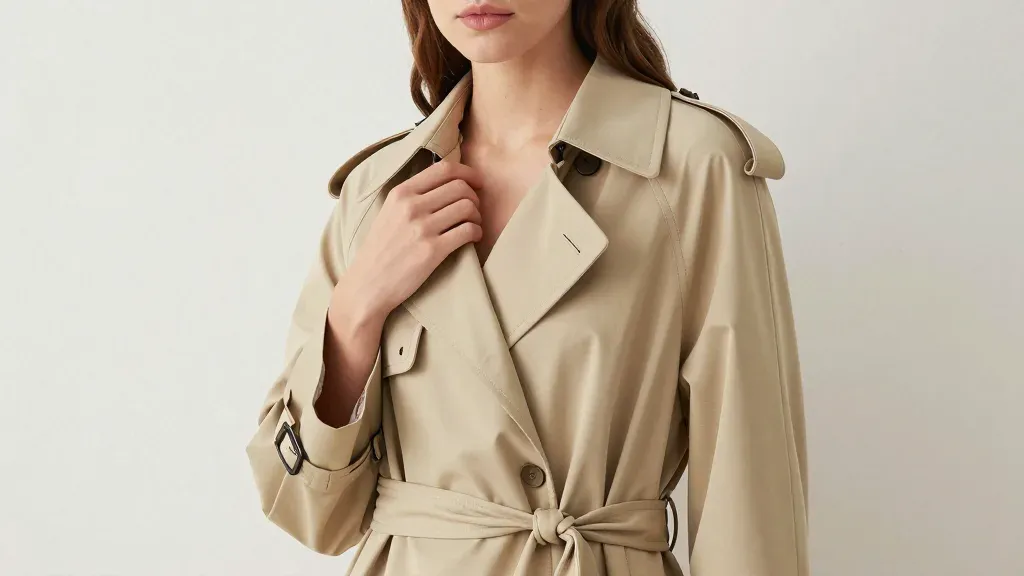 A woman in a beige trench coat adjusts the collar, showcasing the glossy fabric and dark buttons. The soft, diffused lighting highlights the texture and creates gentle shadows, emphasizing the minimalist white background.