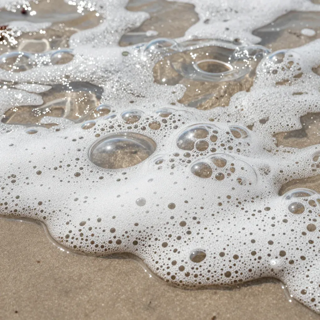 A close-up of ocean foam with glossy, viscous bubbles reflecting sunlight, emphasizing the intricate details and texture against a slightly blurred sandy shore background.