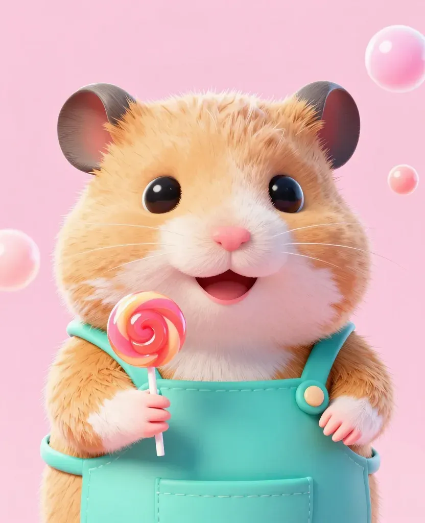 A fluffy hamster with peachy-gold fur and a creamy white muzzle wears turquoise overalls and holds a coral-pink lollipop, smiling with visible joy. Soft front lighting with a gentle rim glow highlights the subject, while a shallow depth of field and floating bubbles create a dreamlike, studio-style composition with a clean, gradient pink background.