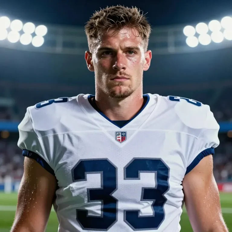 A football player in a crisp white jersey with blue accents and the number 33 stands under bright stadium lights, sweat beads glistening on his skin. The close-up shot emphasizes the player's intensity and the dynamic lighting, creating a high-contrast, high-energy image.