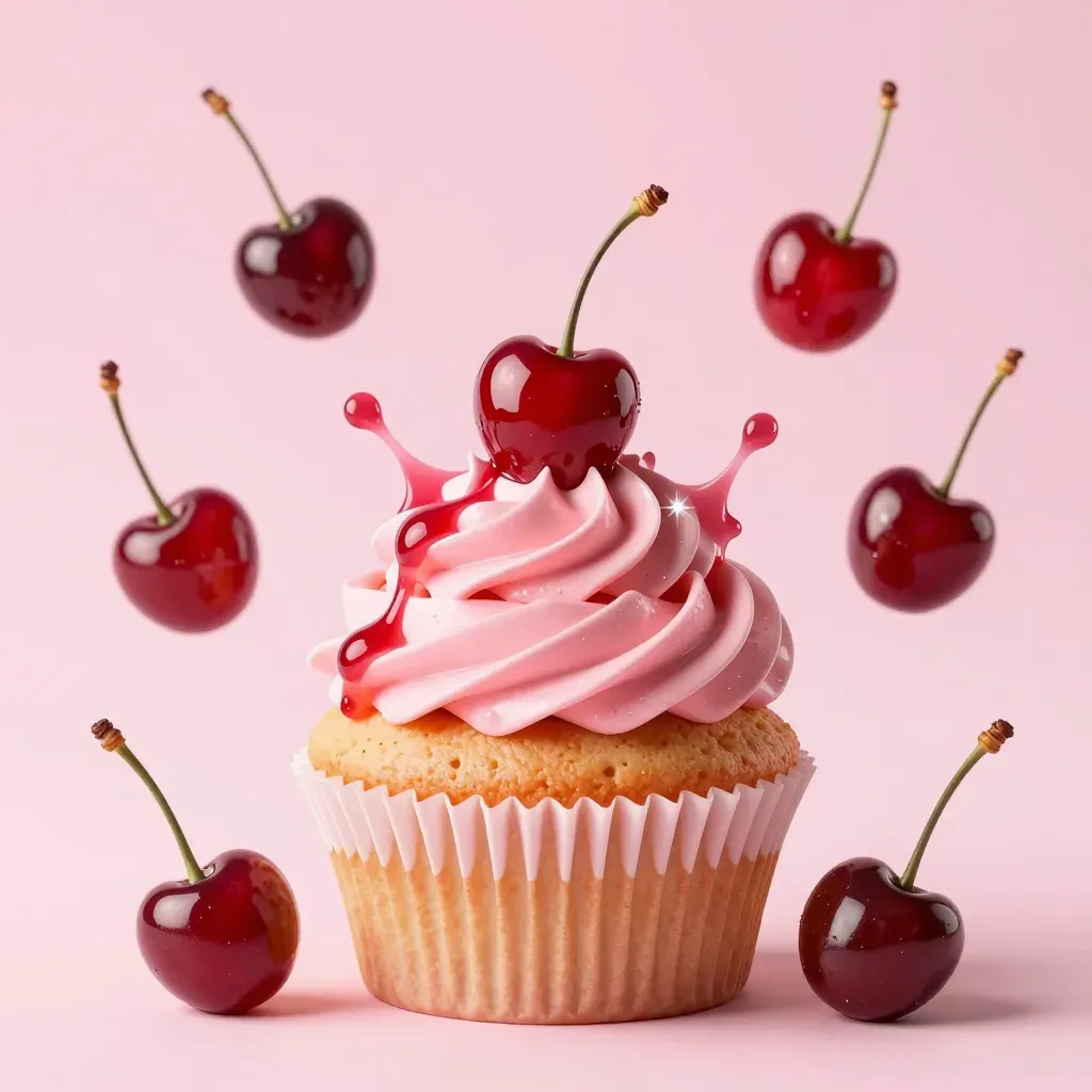 A delectable cupcake with smooth pink frosting and glossy cherries floating around, illuminated by soft, diffused light that highlights the glossy surfaces and creates gentle shadows, set against a blurred solid pink background to emphasize the subject.