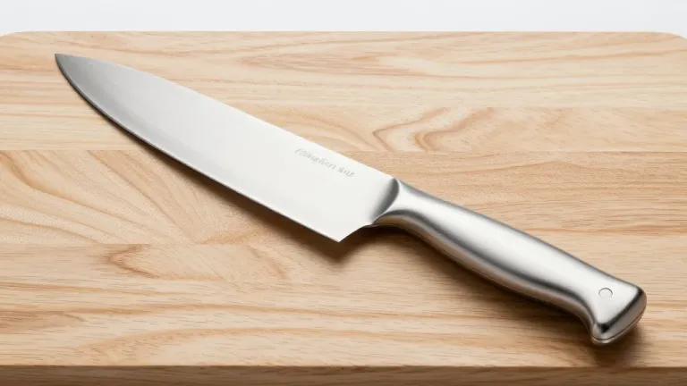 A close-up of a chef's knife with a polished blade and metallic handle resting on a light wooden cutting board. Soft, diffused lighting highlights the knife's reflective surface and the natural grain of the board, creating a clean and professional look.