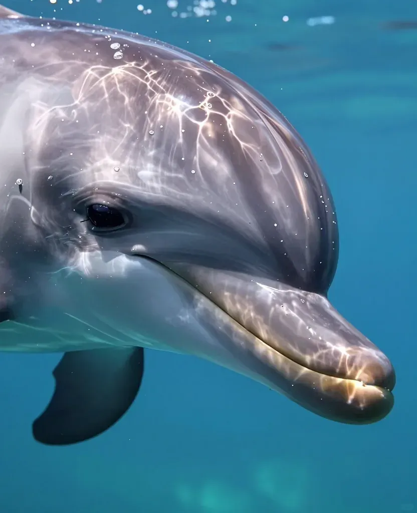 A close-up of a dolphin's snout, showcasing its glossy, smooth, velvety skin with water droplets, illuminated by sunlight filtering through clear blue water. The shallow depth of field blurs the background, emphasizing the subject's texture and reflections.